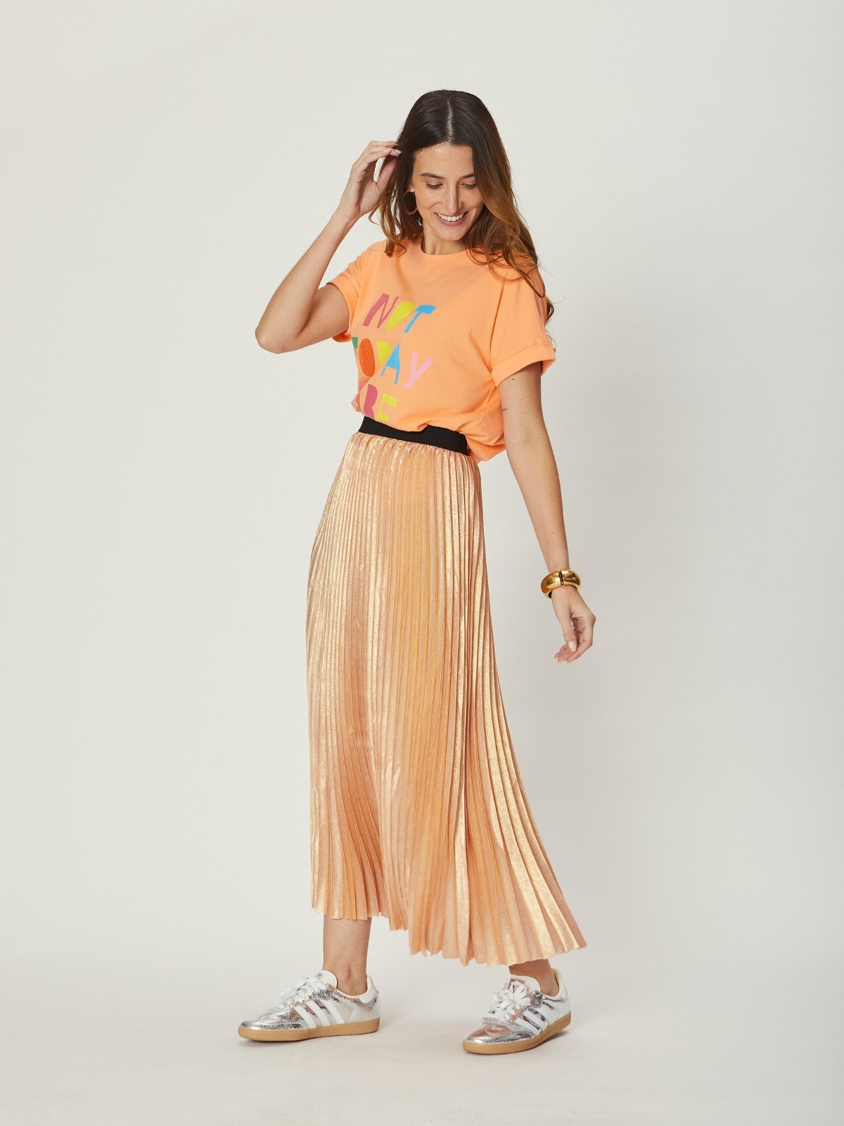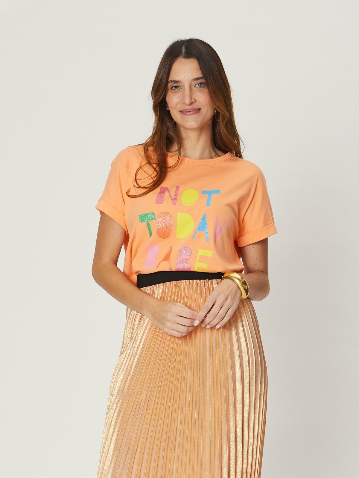 Introducing the Jade Relaxed Tee – Not Today Babe, a bold statement piece designed to bring colour and attitude to your casual wardrobe. Featuring vibrant slogan lettering on a soft orange base, this relaxed-fit tee with rolled sleeves is perfect for easy, laid-back styling. Pair it with skirts or shorts for a playful twist on everyday outfits.