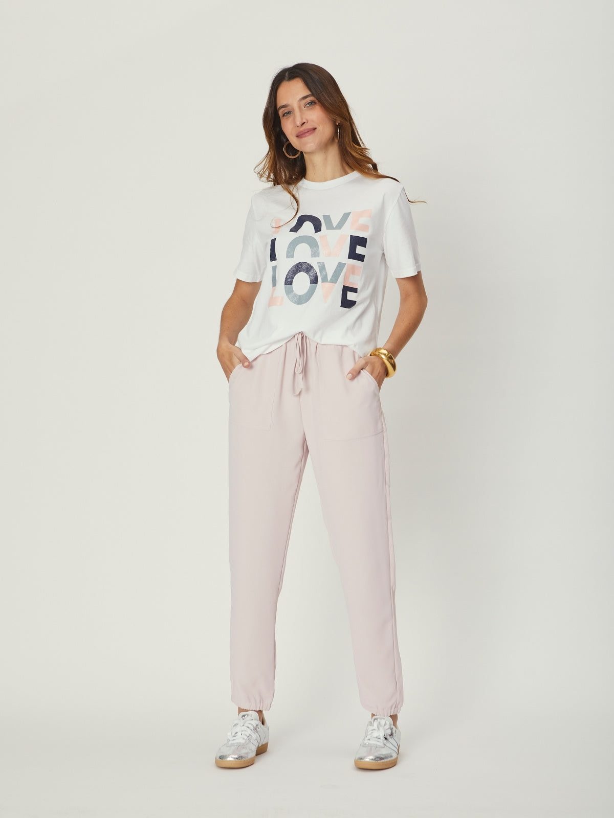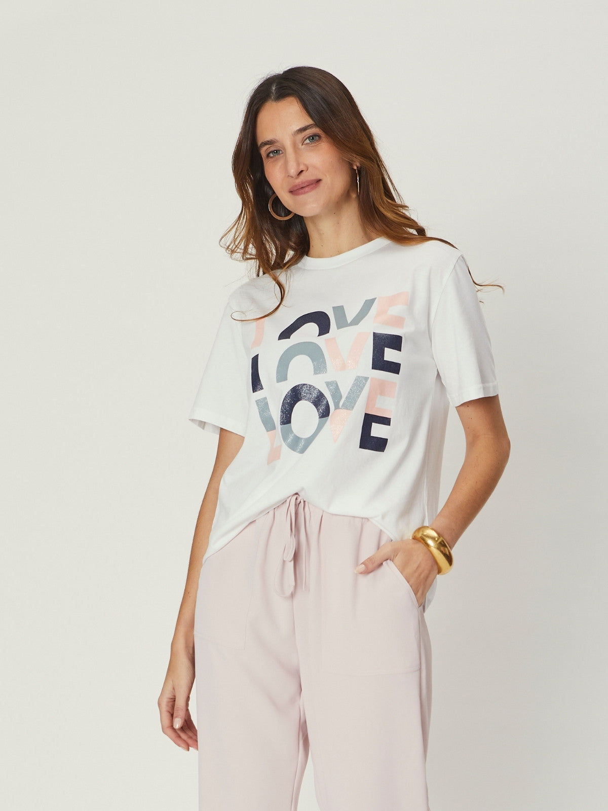 The Lana Vintage Tee – Love Love Love graphic tee is designed to work from day to night. Featuring stacked “Love” lettering in soft tonal shades, it adds an effortless statement to any look. The classic crew neckline and easy relaxed fit make it simple to style with denim or shorts for daytime, then elevate with tailored pieces or a skirt for evenings out. A versatile staple that blends comfort and style in one.